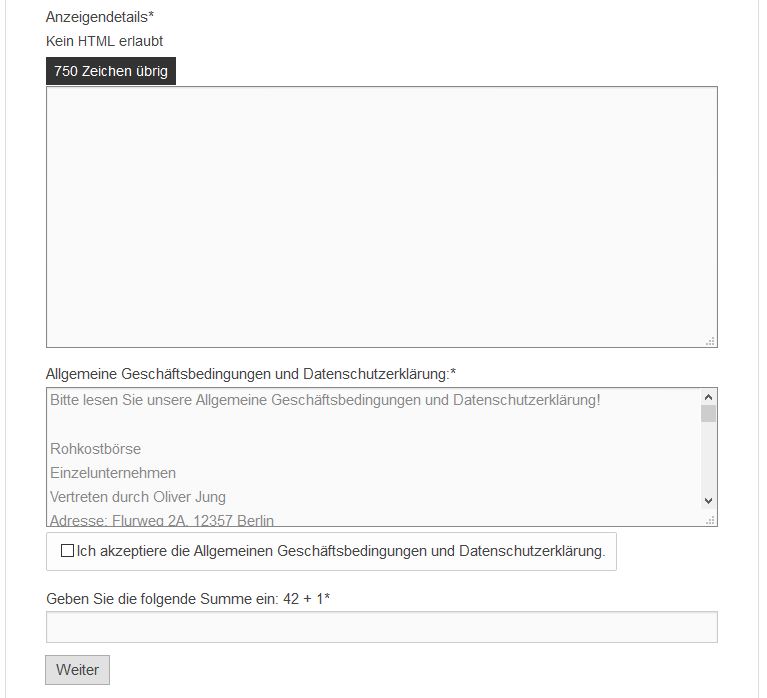 - Bestätigen Sie nach dem Durchlesen die Allgemeinen Geschäftsbedingungen und tragen Sie das Ergebniss der Rechenaufgabe als Bestätigen dafür ein, dass es sich um kein automatisch erstellte Anzeige handelt