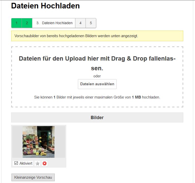 - Bitte beachten Sie dabei, dass die Dateigröße 1 MB nicht überschreiten darf und die Bildgröße mindestens 640 (breit) x 480 (hoch) sein muss und die Datei nicht kleiner als 300 Bytes ist.